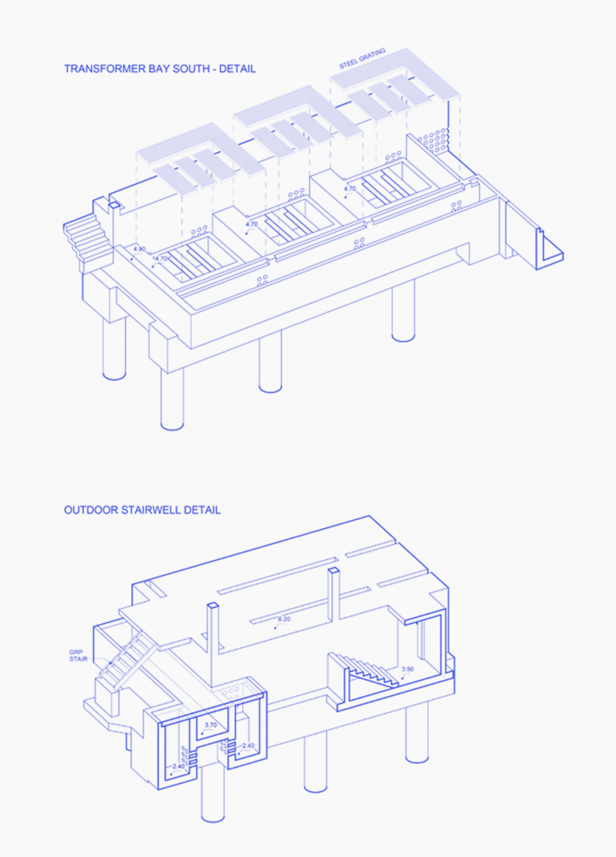 O projeto compreendeu o dimensionamento das estruturas de betão armado do “switchgear building” e desenvolvimento dos respetivos processos de shop drawing. Estes foram desenvolvidos a partir da modelação BIM dos edifícios, incluindo a modelação das armaduras em 3D.
